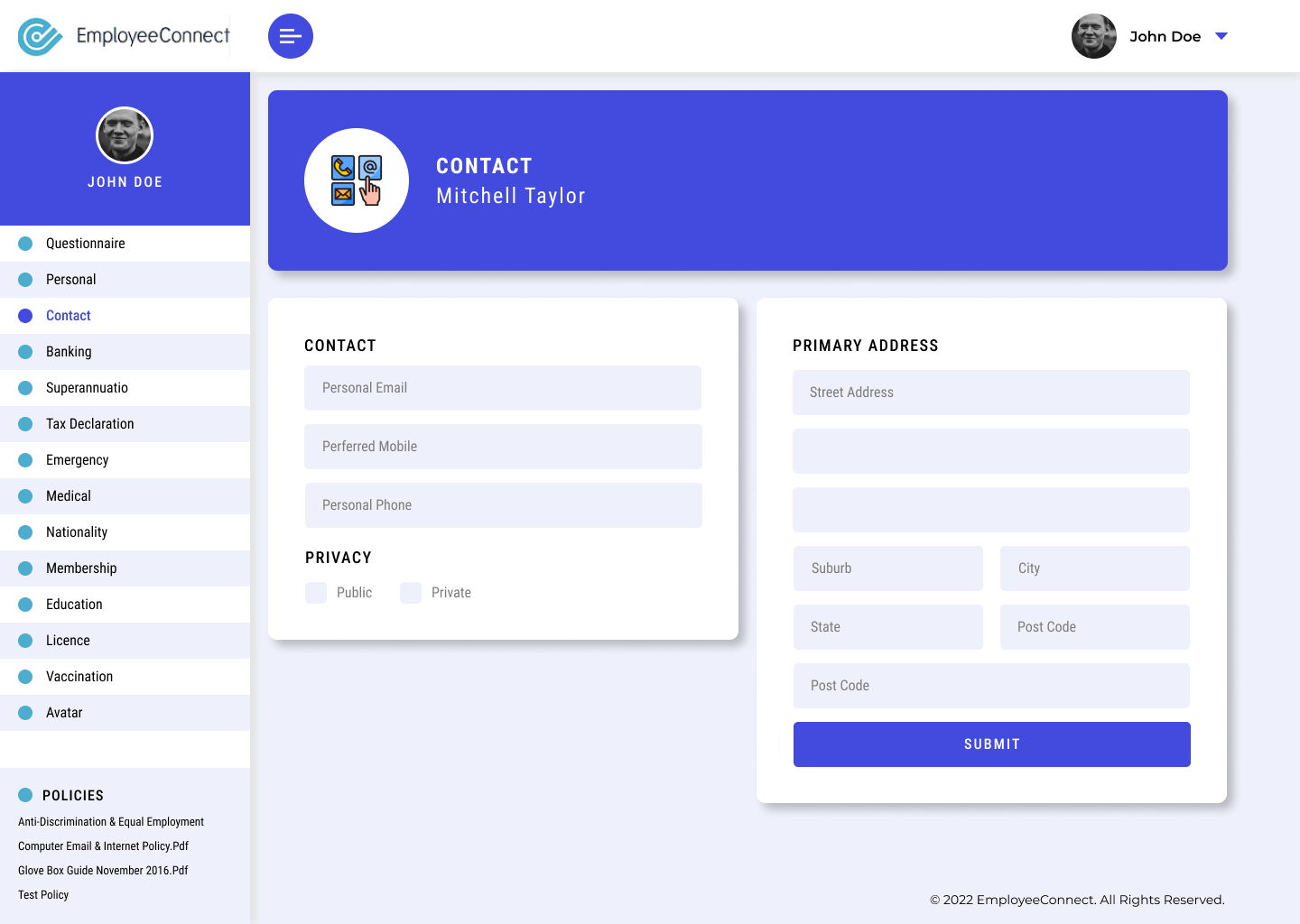 The UI design for Employee Connect focuses on fostering communication, collaboration, and engagement within the workplace. With a clean, organized layout and user-friendly interface, the design prioritizes ease of navigation. Key sections such as company announcements, team discussions, employee recognition, and internal resources are clearly highlighted. Interactive features like direct messaging, polls, and feedback forms allow employees to engage with each other and management seamlessly. The design uses professional yet inviting colors and typography, creating a balanced environment that promotes transparency, team bonding, and productivity.